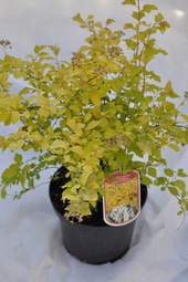 'Gold Fountain' is multi-stemmed deciduous shrub with a georgeus fountain-like form. The leaves are golden yellow, serrated, fine. Features masses of white flowerson arching stems in June. Attract butterflies. Grows best in fertile, moderately-moist soil in full sun. Fully hardy and tolerant of urban pollution. Ideal for mixed borders and rock gardens.