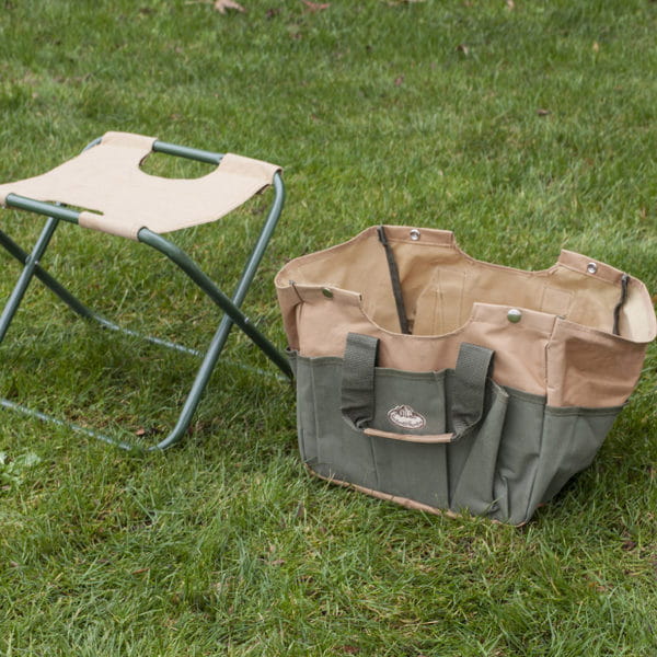 Składane krzesło i torba na narzędzia, którą można z łatwością przenosić. Doskonałe krzesło do siedzenia podczas pracy w ogrodzie. Wyjmowana torba z przestronnymi przegródkami bocznymi zapewnia dużo miejsca na narzędzia i akcesoria ogrodnicze, dzięki czemu są zawsze pod ręką, gdy są potrzebne. Torba jest odpinana za pomocą zatrzasków. Krzesełko jest wielofunkcyjne, może być wykorzystywane również w warsztacie czy na rybach.