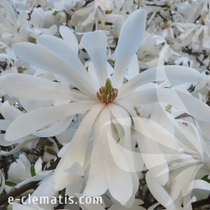 Kwitnie bardzo wcześnie w kwietniu jeszcze przed rozwojem liści. Kwiaty śnieżnobiałe z żółtym środkiem, duże, średnicy około 15 cm, delikatnie pachnące, gwiaździste z licznymi, wąskimi płatkami.